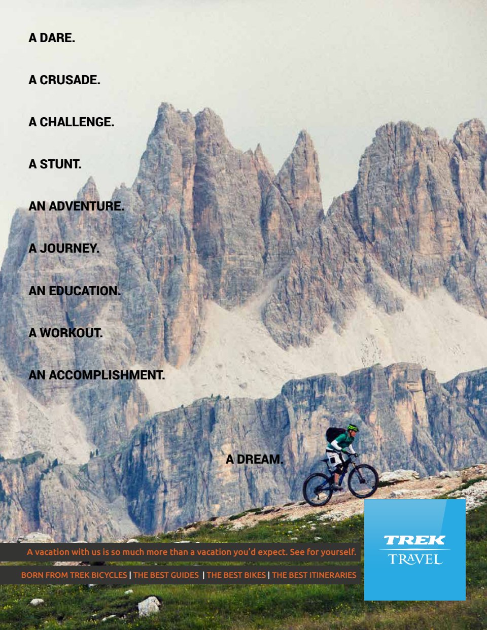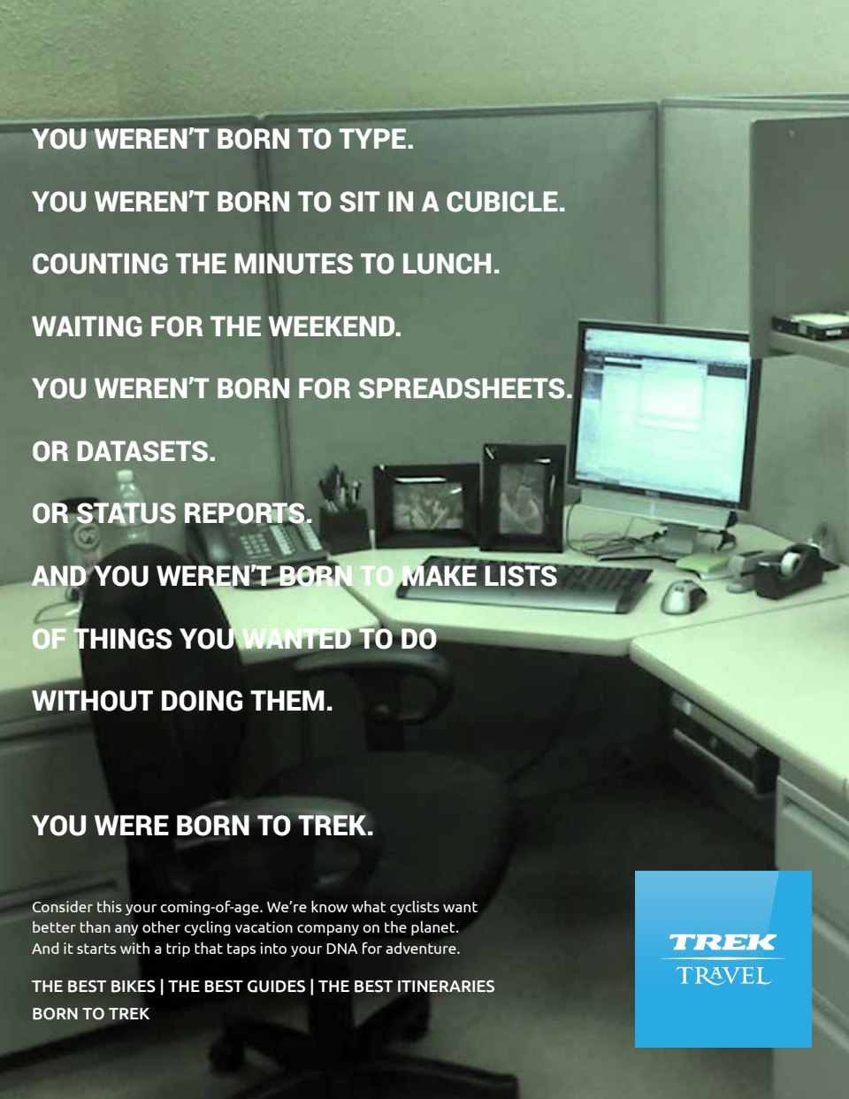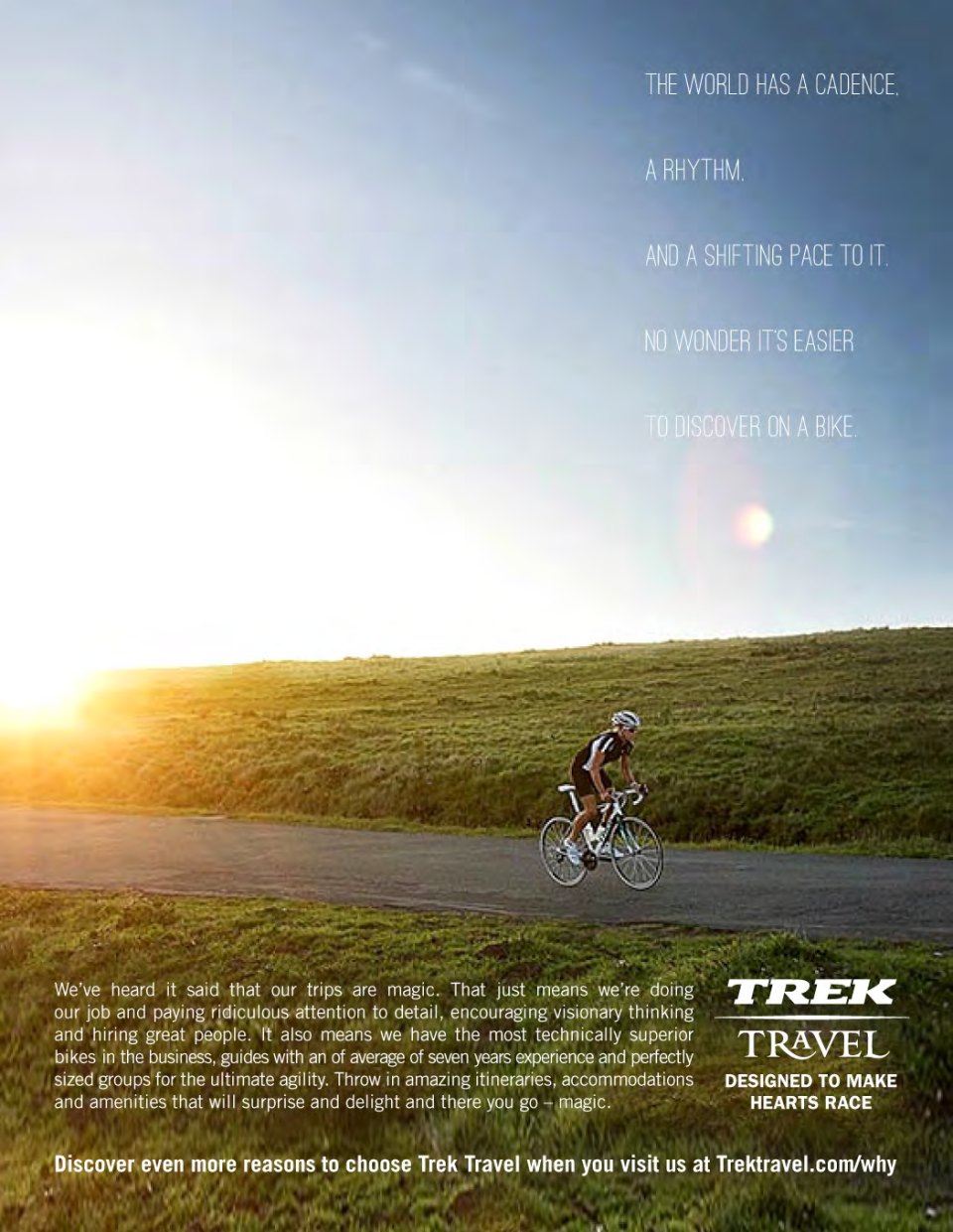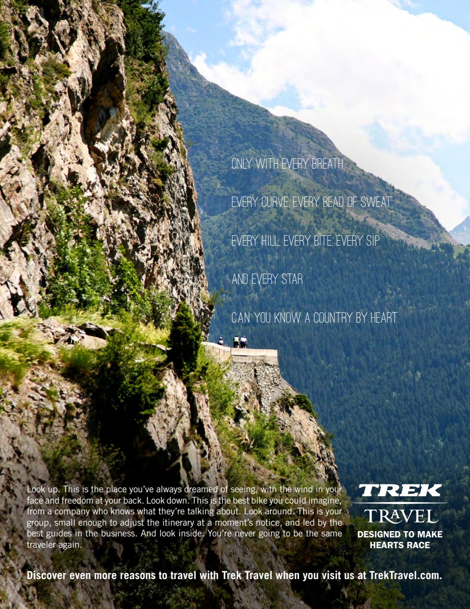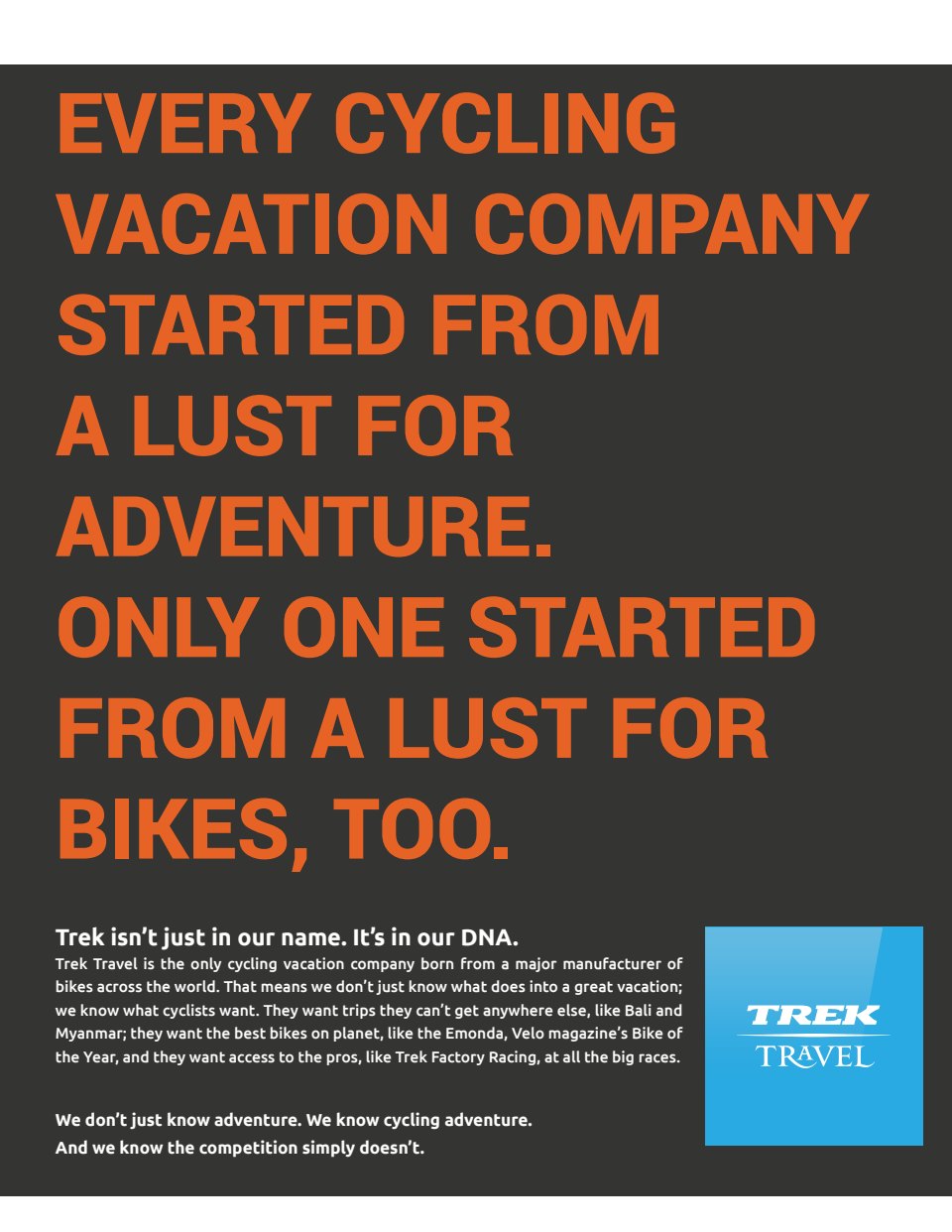 I currently create content (sometimes assisting with strategy) for this cyclotourism brand, born from Trek bikes, including the development of all print, digital and web copy. Because of their relationships with Trek properties, they offer much more than typical cycling tours, traveling to major races and events like the Spring Classics, Etape du Tour, Giro and Vuelta bike races.