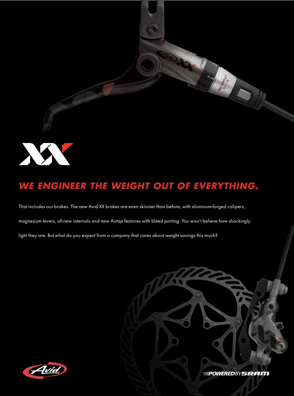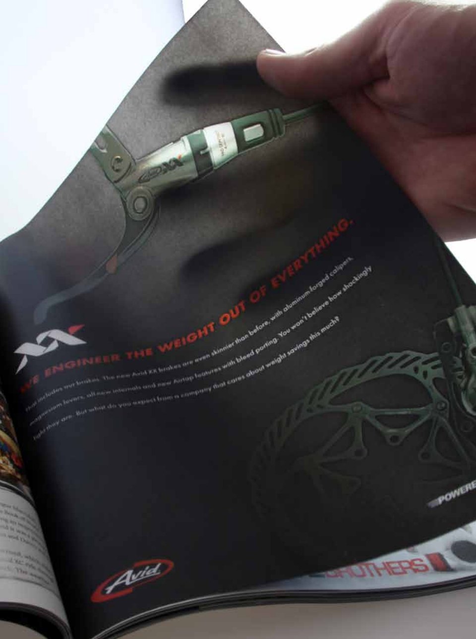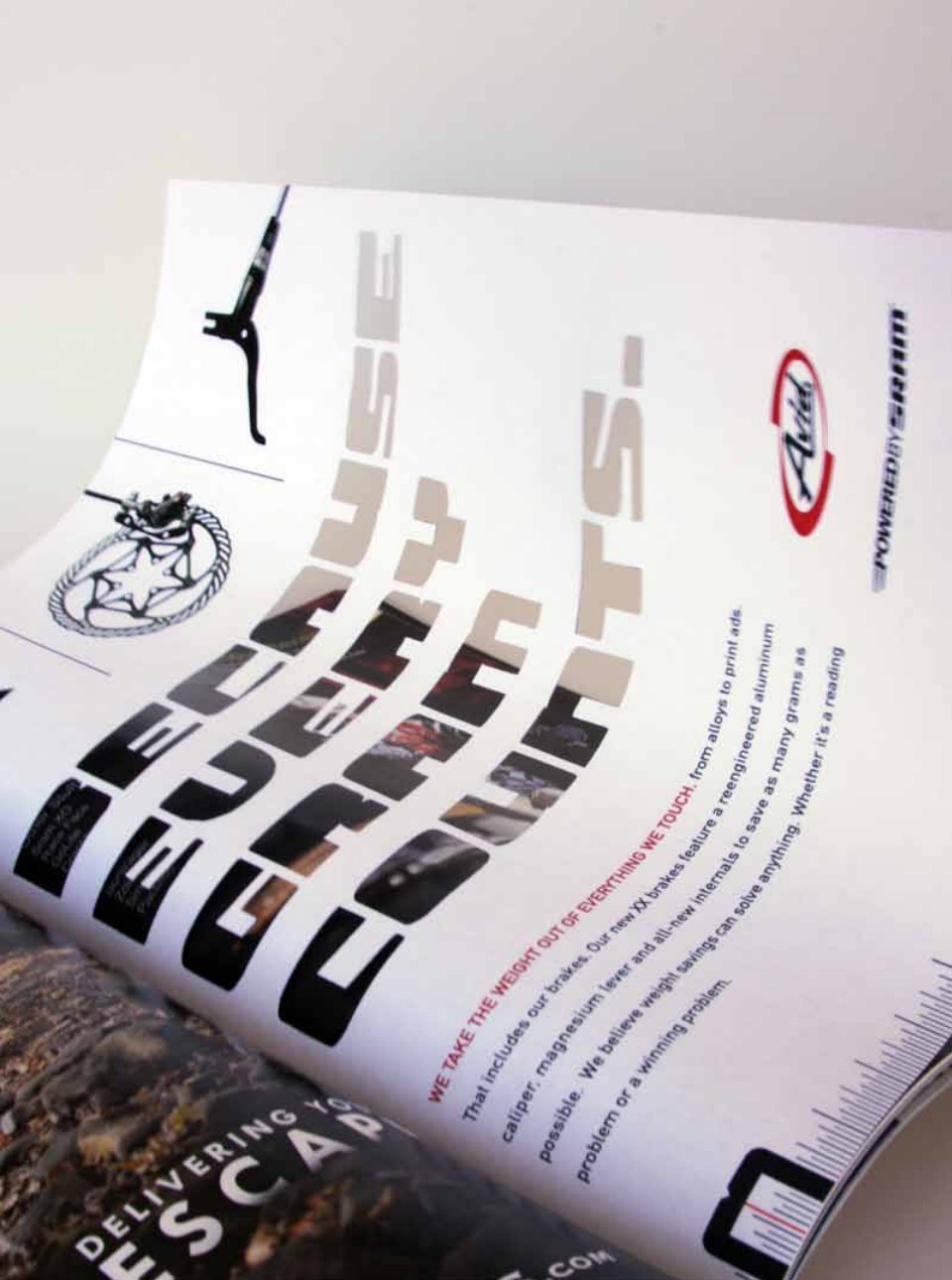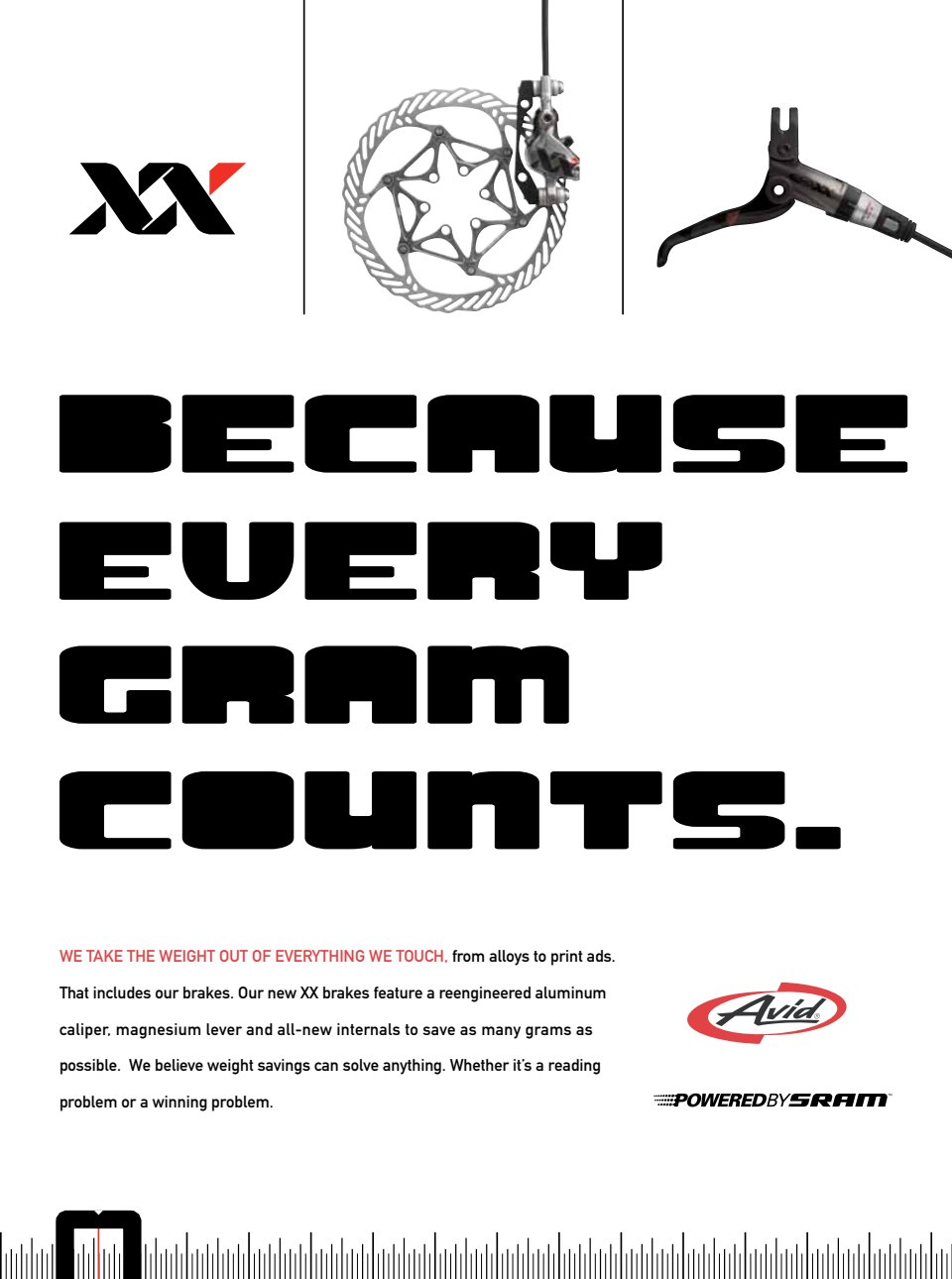 When SRAM debuted their Avid XX brakes, they were among the lightest on the market. This is how we told the story in a new way. The ads themselves are printed on heavyweight vellum or used a die-cut for “added weight savings” and to show the brands commitment to all things lightweight. (Scroll through to see how this looks in placement.)